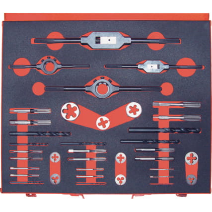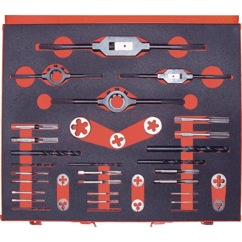 | Includes | (2) Bar Type Tap Wrench: 1/16" -1/4" , 3/16" - 1/2" (2) Die Stock: 13/16" 1" (2) HSS Die Nuts: M12-1.75, M16-2.00 (2) HSS Dies 1" O/D: M8-1.25, M10-1.50 (5) HSS Dies 13/16" O/D: M2-0.40, M3-0.50, M4-0.70, M5-0.80, M6-1.00 (8) HSS Jobber Drills: 1.60mm, 2.50mm, 3.30mm, 4.20mm, 5.00mm, 6.80mm, 8.50mm, 10.20mm (8) Straight Flute Plug Taps: M2-0.40, M3-0.50, M4-0.70, M5-0.80, M6-1.00, M8-1.25, M10-1.50, M12-1.75 (8) Straight Flute Taper Taps: M2-0.40, M3-0.50, M4-0.70, M5-0.80, M6-1.00, M8-1.25, M10-1.50, M12-1.75 Metal Case |
