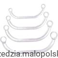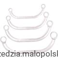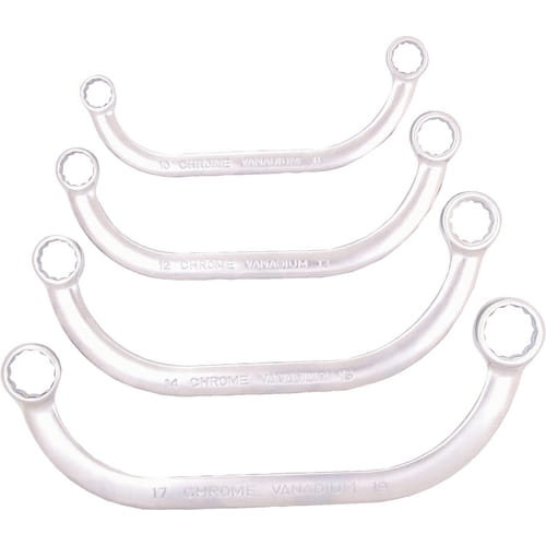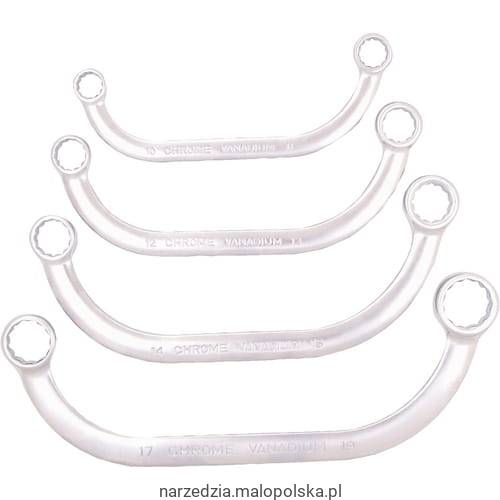 Bardzo cienki wzór, wykonanie ze stali chromowo-wanadowej. Dwustronne, z dwunastokątnymi oczkami o niejdnakowych rozmiarach. Użyteczne w miejscach o utrudnionym dostępie, gdzie konwencjonalne klucze nie byłyby w stanie dotrzeć.4-sztukowy zestaw kluczy oczkowych dwustronnych, wygiętych; metryczny: